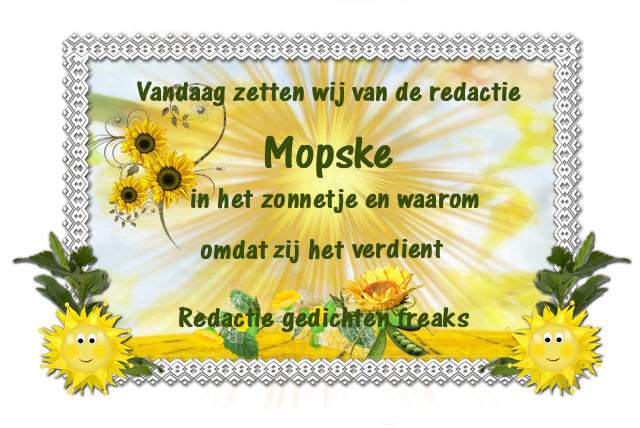 | als ik het een gun, dan is het onze laive Mopske wel.. wel verdiend...dat ze nog maar veel zonnetjes mag krijgen i.v.b met haar sunnes warme groetsels |