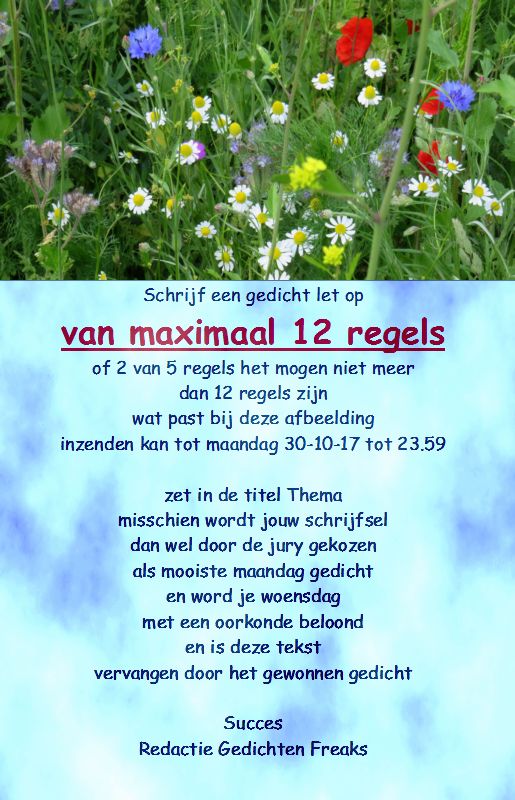 | Als een foto een bepaalde sfeer uitstraalt kan dit een inspiratiebron zijn. Voor mij hoeft dus niet letterlijk de voorstelling op de foto de inspiratiebron te zijn. Andersom werkt het ook, er zijn gedichtjes die ik ooit geschreven heb die ik pas veel later linkte aan een foto. Vaak omdat de voorstelling, of iets in de voorstelling mij deed denken aan dat gedicht. |