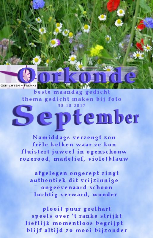 | September hartelijk gefeliciteerd met je mooie gedicht. Groetjes Claire | |