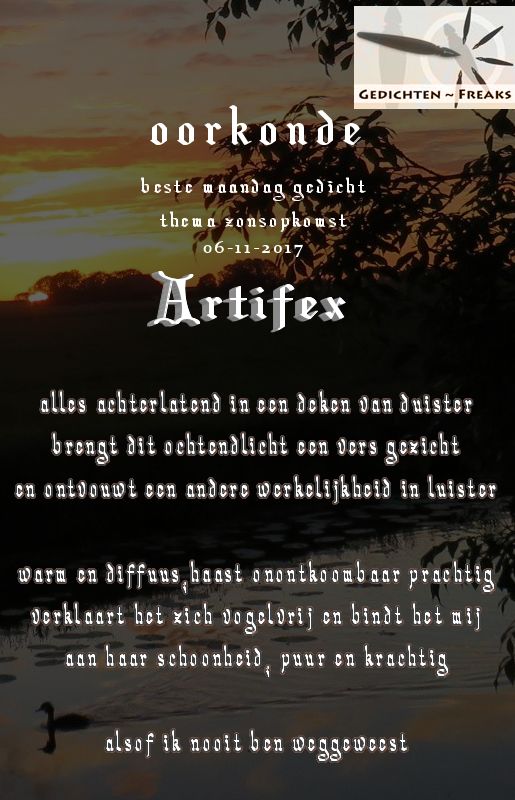 | Het was te voorspellen Artifex! Dikke proficiat met het gewonnen gedicht, geniet er maar van. Fijne avond wens ik je. Anneke |