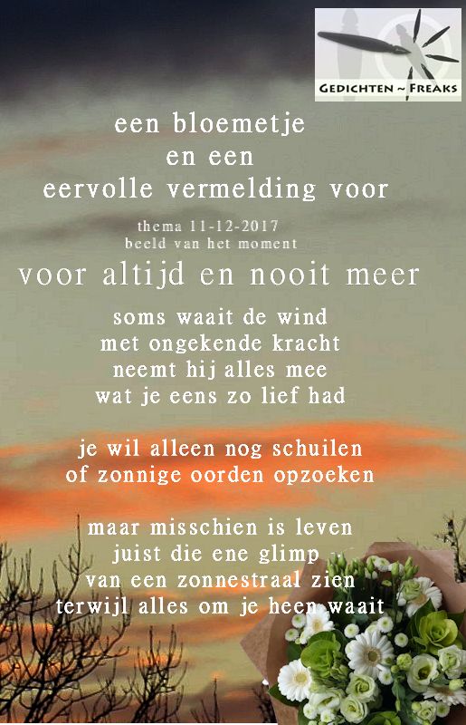 | Van harte gefeliciteerd met de welverdiende eervolle vermelding en het mooie bloemetje voor dit mooie gedicht. Liefs | |