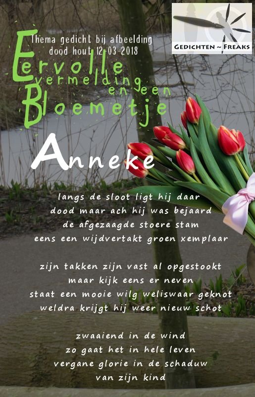 | Van harte gefeliciteerd Anneke met de mooie eervolle vermelding en het bosje bloemen voor dit prachtig gedicht. Liefs | |