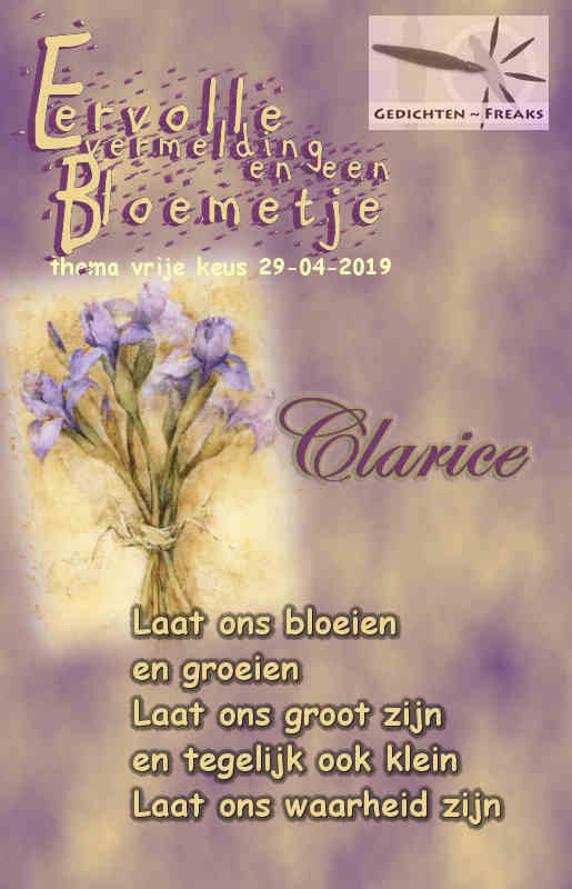 | Van harte gefeliciteerd met de mooie eervolle vermelding en prachtig sierende bloemen die dit fijn mooie gedicht omlijsten. Welverdiend Clarice. | |