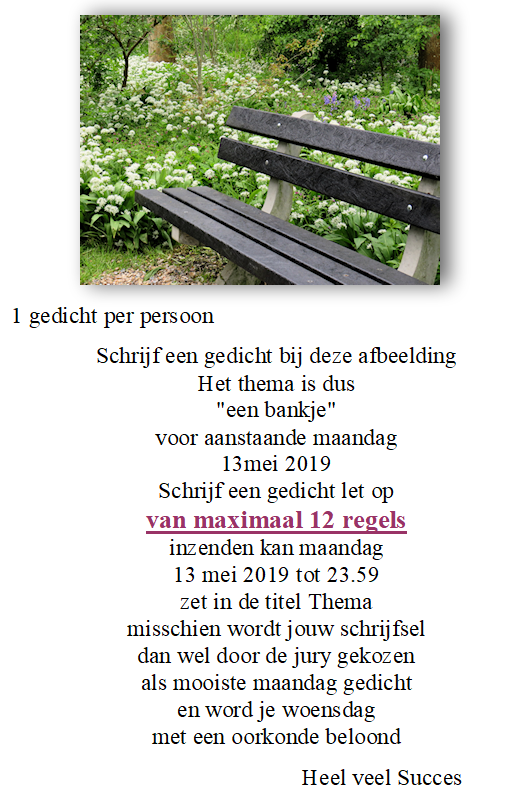 | Samen zittend op de bank omhult met bloemen Jij bruin ik blank deelden we onze geheimen Kerfden we onze namen in de rand deelden we lief en leed Tot zij kwamen voorbij Nu alleen zittend op de bank omhult met bloemen rest enkel nog onze namen in de rand |
