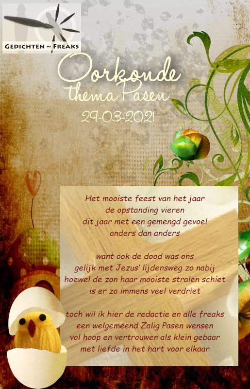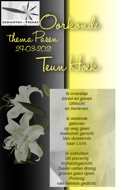 | Dankjewel redactie voor deze mooie oorkonde. Teun jij ook gefeliciteerd, je gedicht verdient het. Zonnige groet op weg naar Pasen. Anneke |