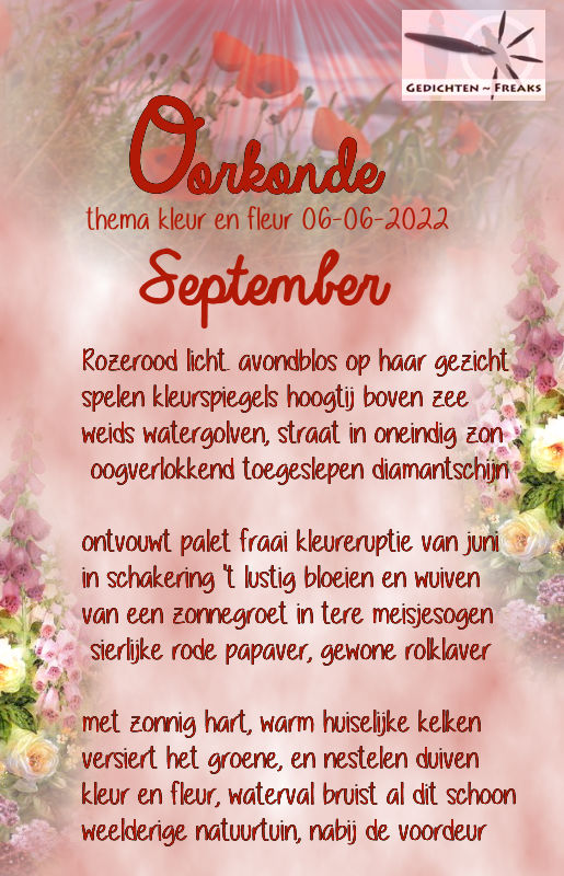 | Een warme felicitatie met de winnende oorkonde Maya, met recht verdient voor je prachtige gedicht over kleur en fleur. Fijn om het weer te herlezen. Geniet ervan en lieve groeten. Anneke |